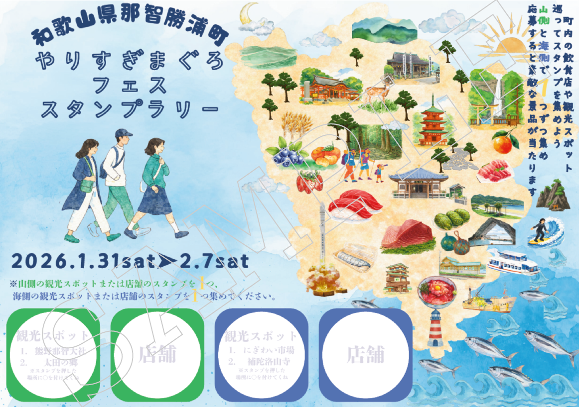 まぐろを味わい、町をめぐって、最後は豪華景品にチャレンジ!やりすぎまぐろフェス期間中、参加無料のスタンプラリーを開催します。 スタンプラリーの楽しみ方 ① 山側・海側エリアの観光スポットや対象店舗を巡ってスタンプを集めよう② 観光・食事・買い... -
